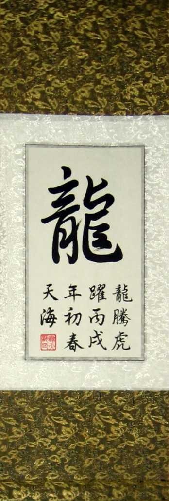 Chinese dragons have very positive meanings, so the Chinese Proverb Dragon Art Calligraphy Symbols Scroll is a nice gift for anyone on your list.The Chinese Proverb Dragon Art Calligraphy Symbols Scroll tells us "dragon soars and tiger leaps." This Chinese Proverb Dragon Art Calligraphy Symbols Scroll is a hand painted Chinese art work by Beijing, China artist Xie Tian Hai. Our Chinese Proverb Dragon Art Calligraphy Symbols Scroll measures 8.5x24 inches.